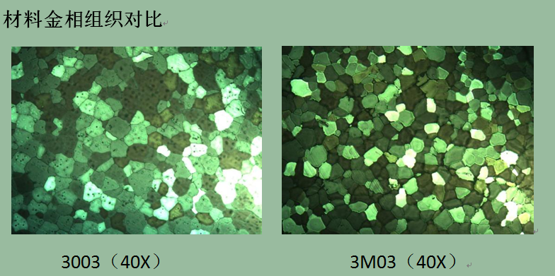 以上將3003、3M03做金相晶粒分析,通過對比,發現3M03合金晶粒度較3003更為細密,這是因為一定含量的Mg元素對晶粒細化產生影響。較為致密的晶粒使材料沖壓性能得到有效提升
